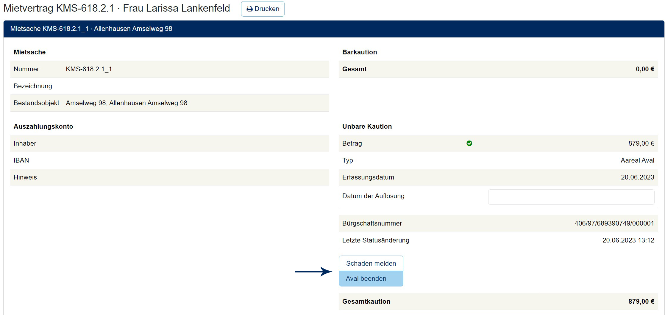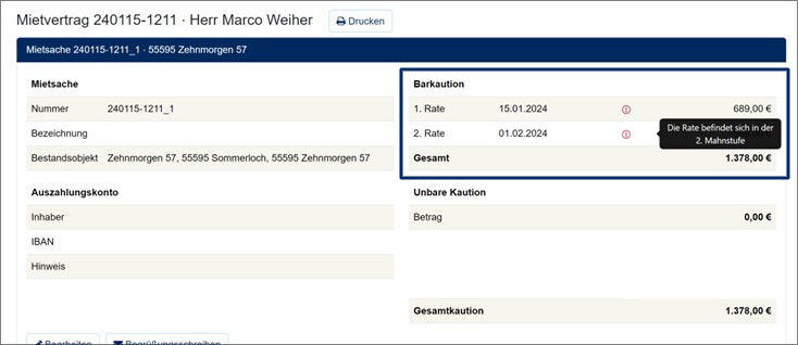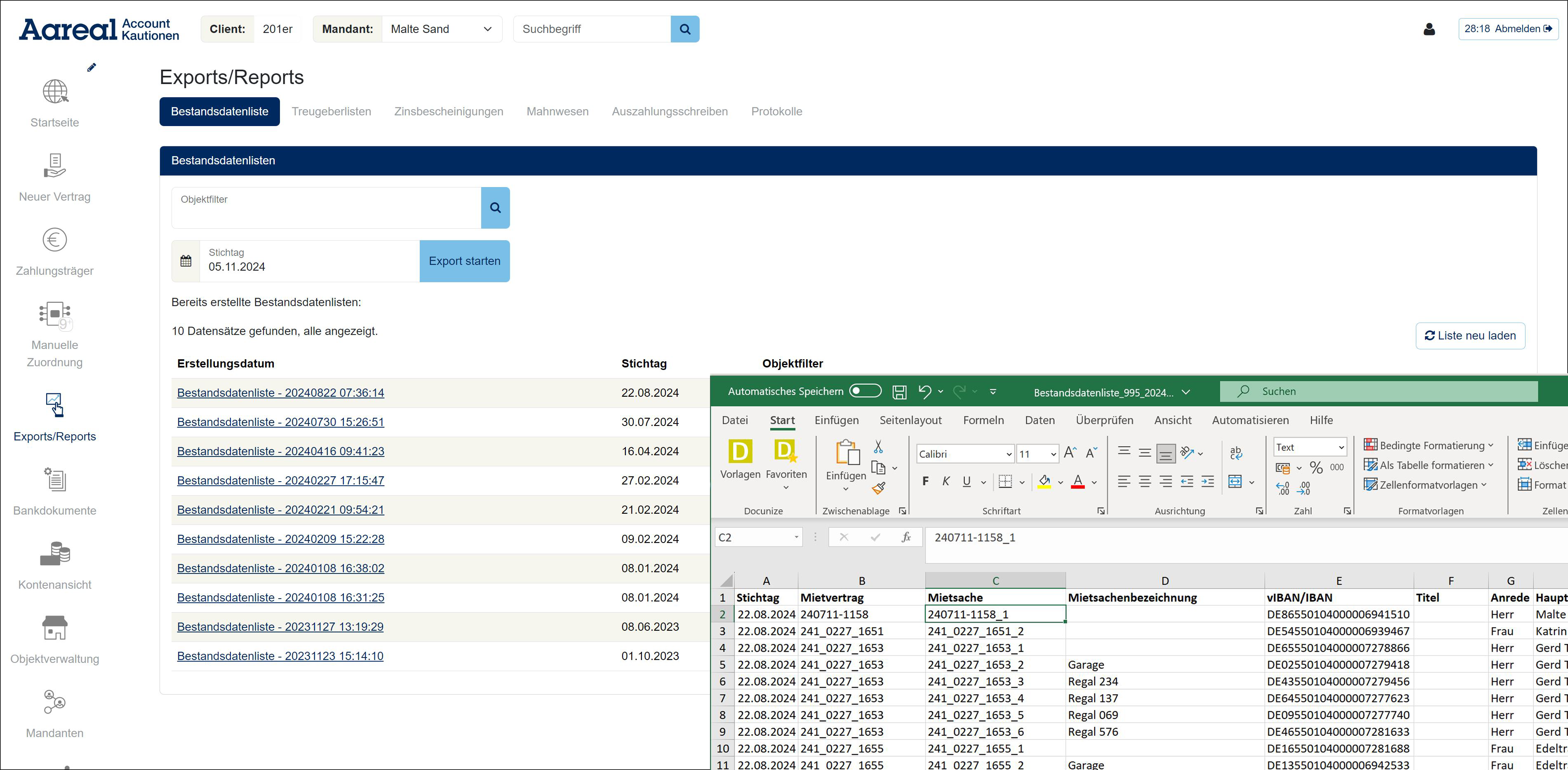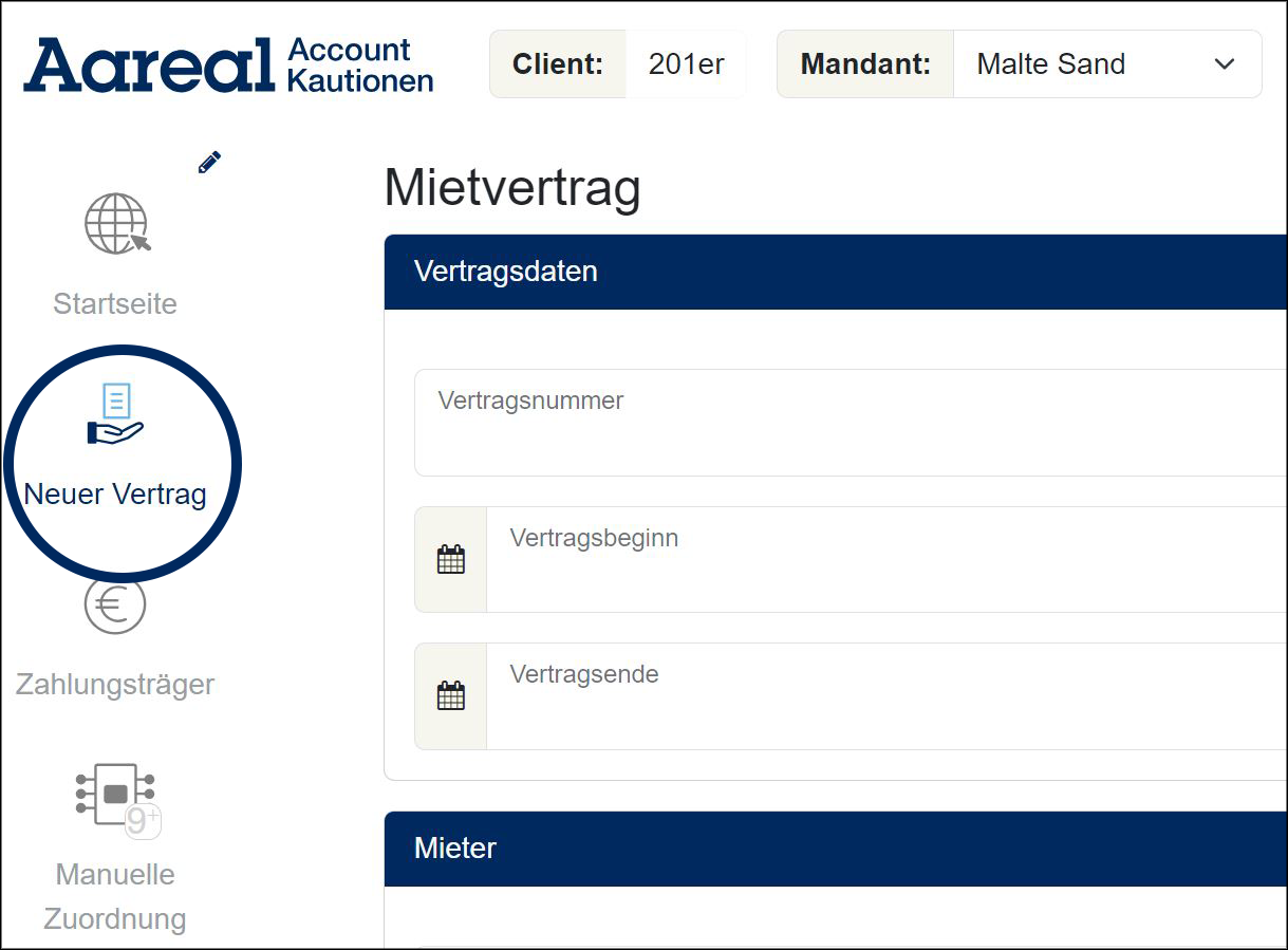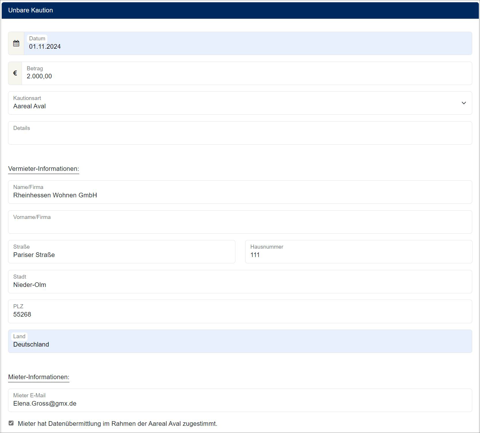 Zuerst sind die Stammdaten einzutragen, so wie sie im Mietvertrag zu finden sind. Das dauert in der Regel nur wenige Minuten. Mit diesen Angaben stellt Ihnen Aareal Account Kautionen sofort eine persönliche virtuelle IBAN zur Verfügung, die Sie Ihrem Mieter mitteilen. Diese kann er umgehend nutzen, um per Überweisung Einzahlungen zu tätigen, die zu 100 % sicher verwaltet und ihm zugeordnet werden.