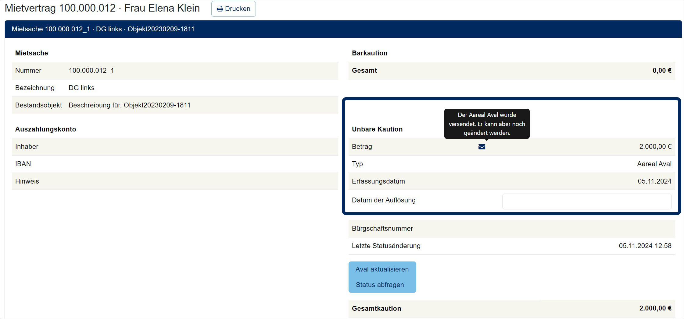 Ebenfalls automatisch erfolgt der Versand einer E-Mail an den Mieter, dieser vervollständigt die Daten und kann innerhalb von wenigen Minuten die Bürgschaft online abschließen. Der Abschluss des Mieters wird automatisch in Aareal Account Kautionen angezeigt.