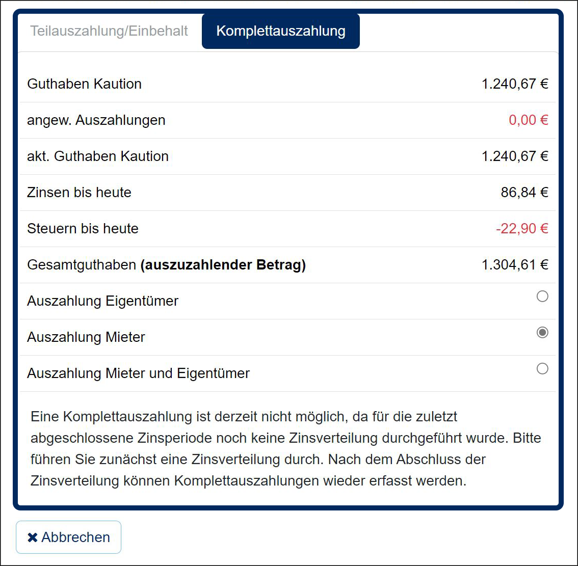 2. Beispiel: Komplettauszahlung mit Warnhinweis (vor Auszahlung findet die Zinsverteilung statt.)