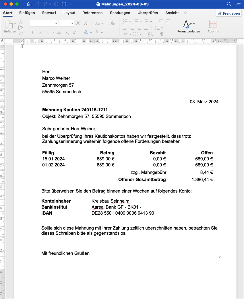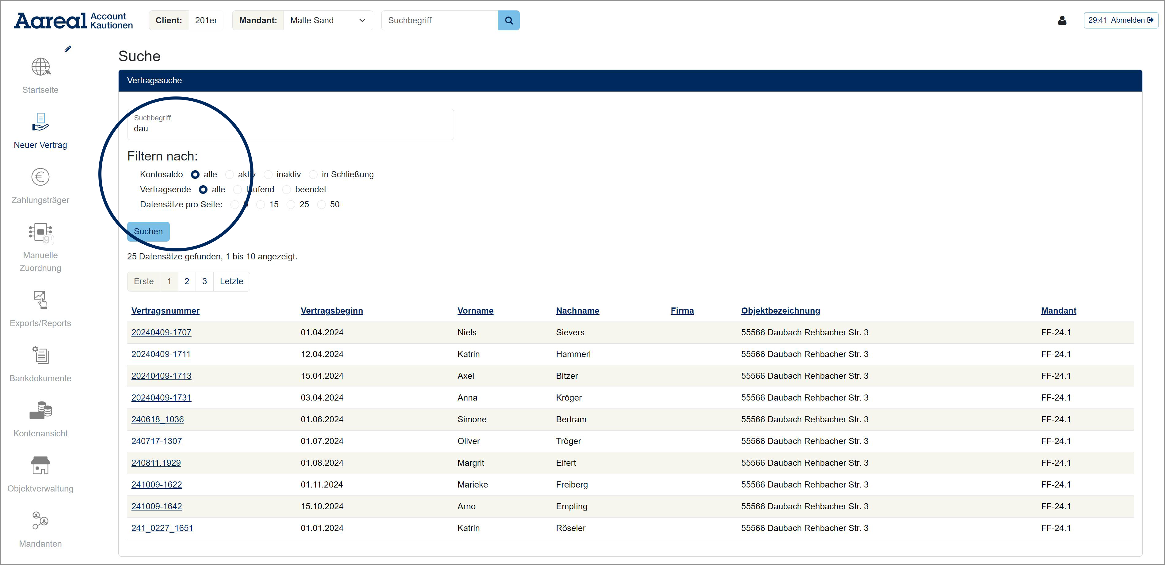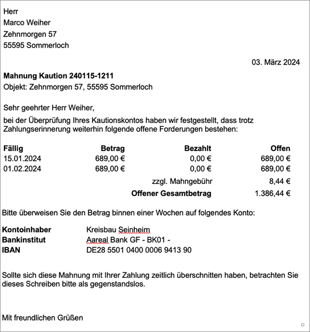 Zu jedem von Ihnen eingepflegten Mieter-Stammdatensatz stellen wir Ihnen eine persönliche virtuelle IBAN zur Verfügung. Diese reichen Sie an Ihren Mieter weiter. Unter Verwendung dieser Kennung kann er seine Kaution ganz oder in Teilen per Überweisung einzahlen. Sie wird automatisch dem entsprechenden Mieter-Konto in Aareal Account Kautionen zugewiesen.