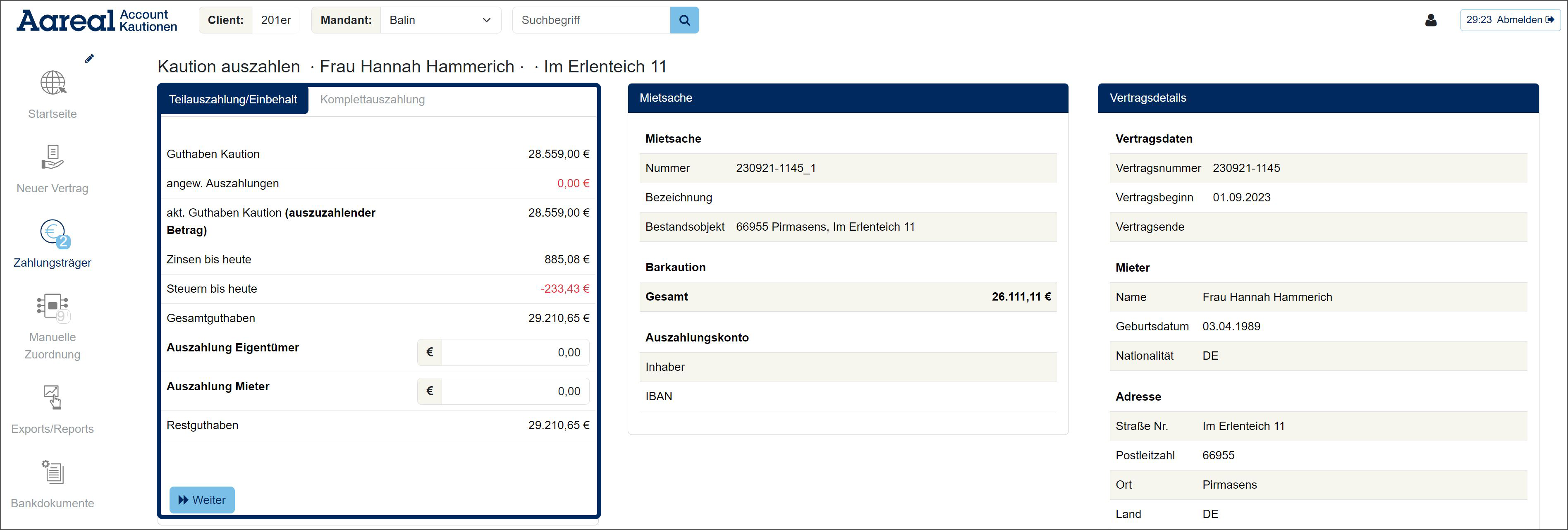 Ob Sie eine Komplettauszahlung oder nur eine Teilauszahlung der Kaution veranlassen möchten, Sie können in wenigen Schritten eine Auszahlung per Überweisung tätigen. Eine Auskunft über den verfügbaren Gesamtbetrag sowie eine Zinsabrechnung zum gewählten Stichtag erhalten Sie automatisch dazu. Auch Einbehalte können problemlos vorgenommen werden. In Aareal Account Kautionen finden Sie zudem eine Übersicht zu den bereits ausgezahlten, transferierten und gebuchten Auszahlungen.